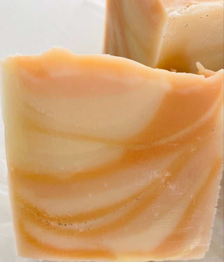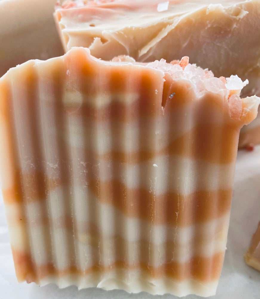 You will love this aroma of peaches in this sweet smelling cleansing bar. Beautifully swirled in peach accents throughout this smooth and creamy soap bar. Gently scented with Peach Prosecco and colored with different shades of peach micas.