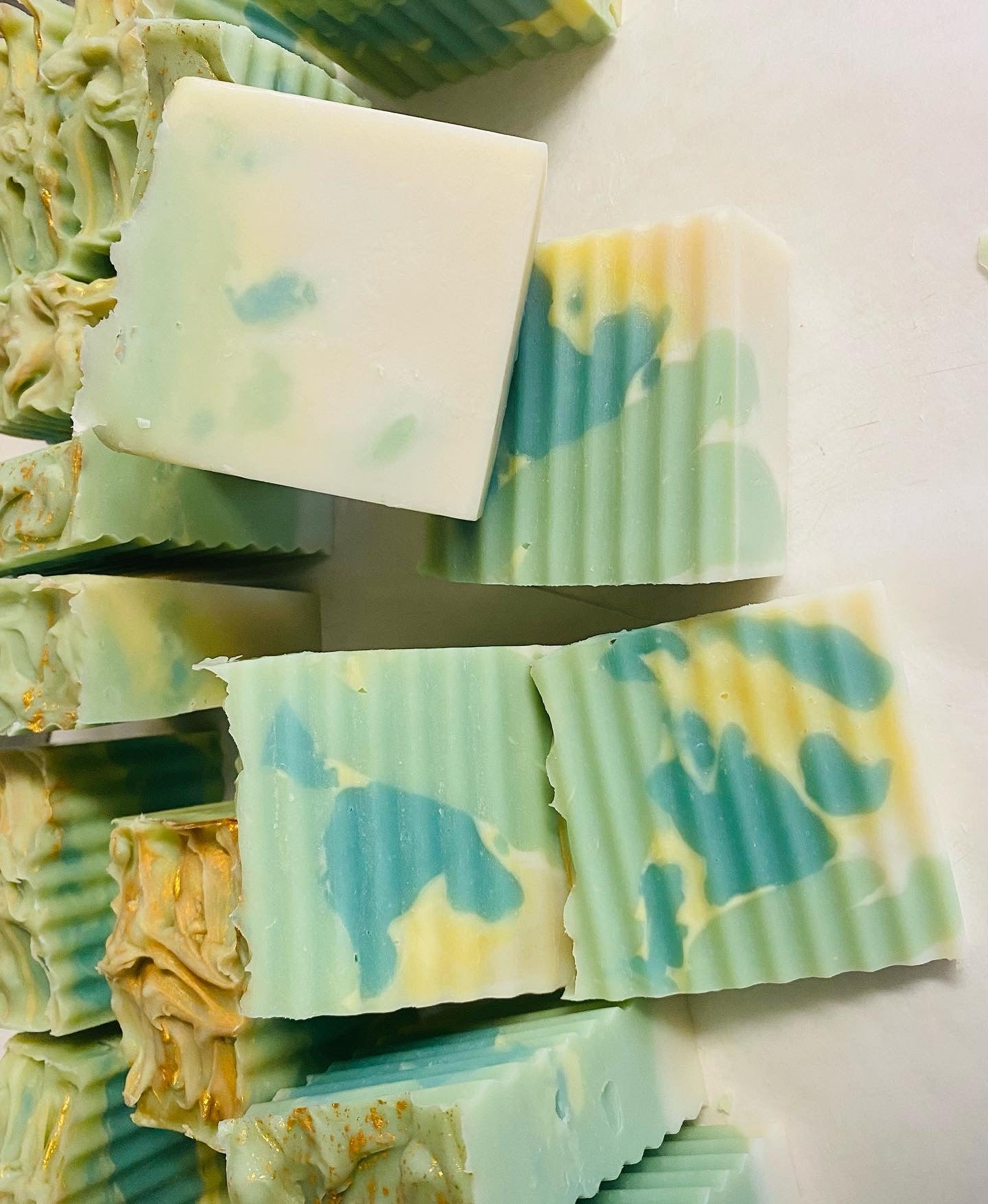 Ingredients: Olive Oil, Distilled water, Coconut Oil, Sodium Hydroxide, Shea Butter, Cocoa Butter, Castor Oil, Fragrance/Essential Oil, Kaolin Clay, Citric Acid, Mica